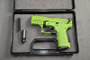 Pistole in limitierter Farbe "Zombster" in grün. Sie wurde nie abgefeuert. Kaliber 9mm P.A.K. Lieferung mit Koffer, Magazin, Reinigungsbürste und Abschussbecher.