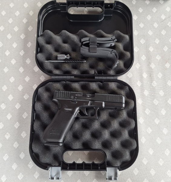 Sie kommt im Originalen Glock Koffer mit Abschussbecher und Reinigungsbürste und Verschiedenen Griffstücken
