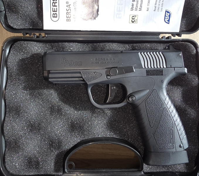 Hallo, biete hier von ASG eine Bersa SA BP9CC in 4,5mm BB in schwarz. Die waffe ist im neuwertigen zustand und wurde nicht geschossen. Waffe ist aus Metall und Kunstoff und hat blowback. Mit dabei ein Waffenkoffer, anleitung.