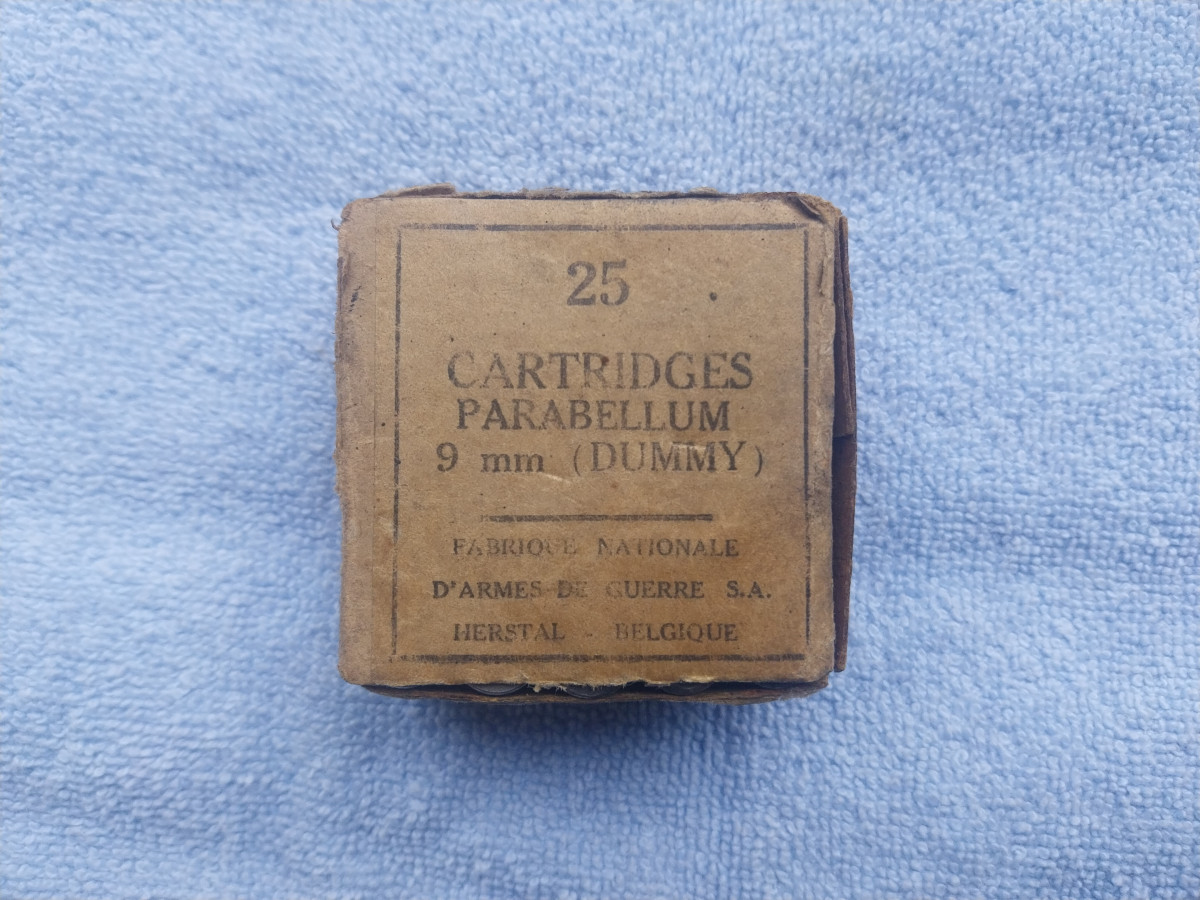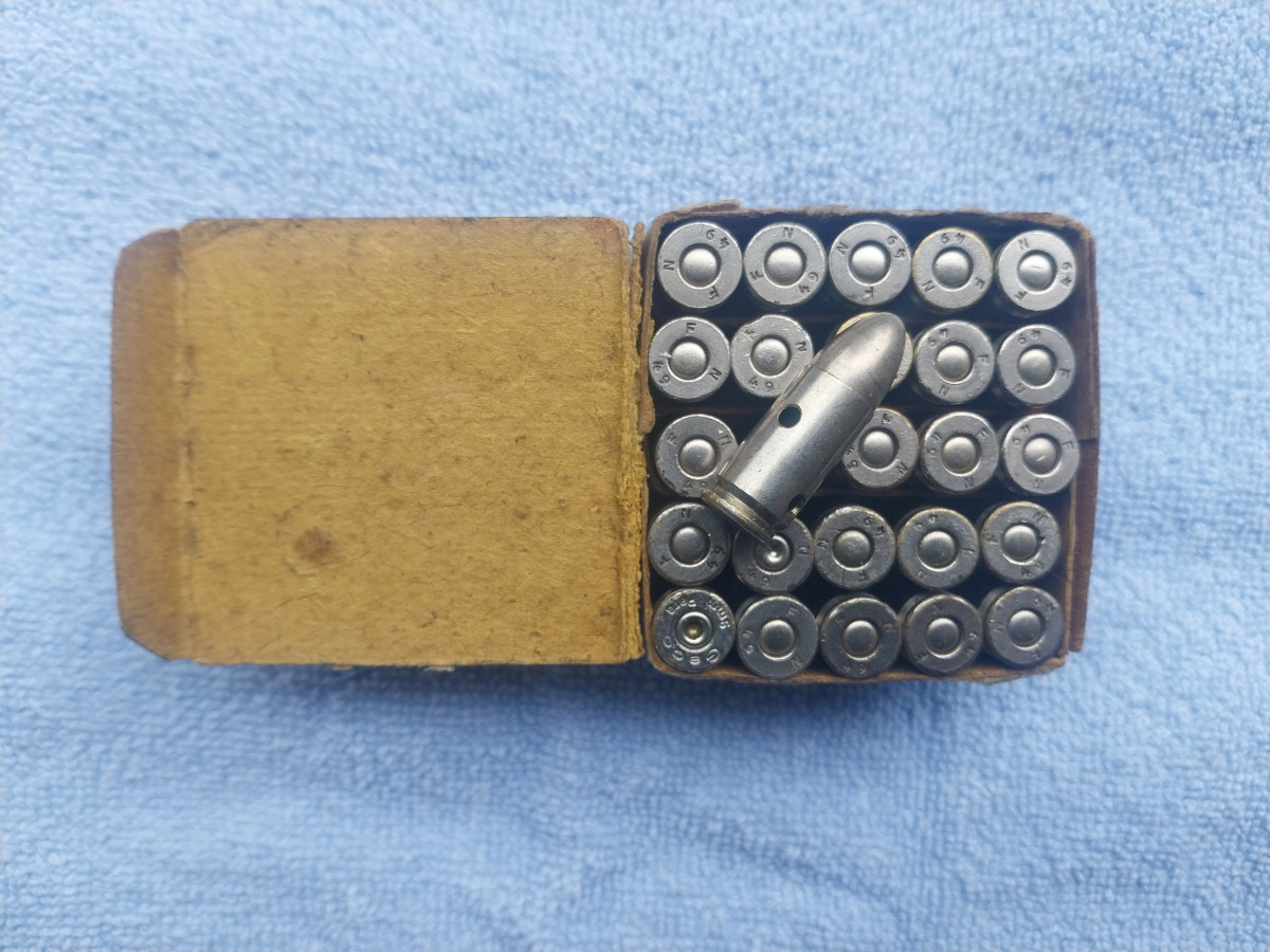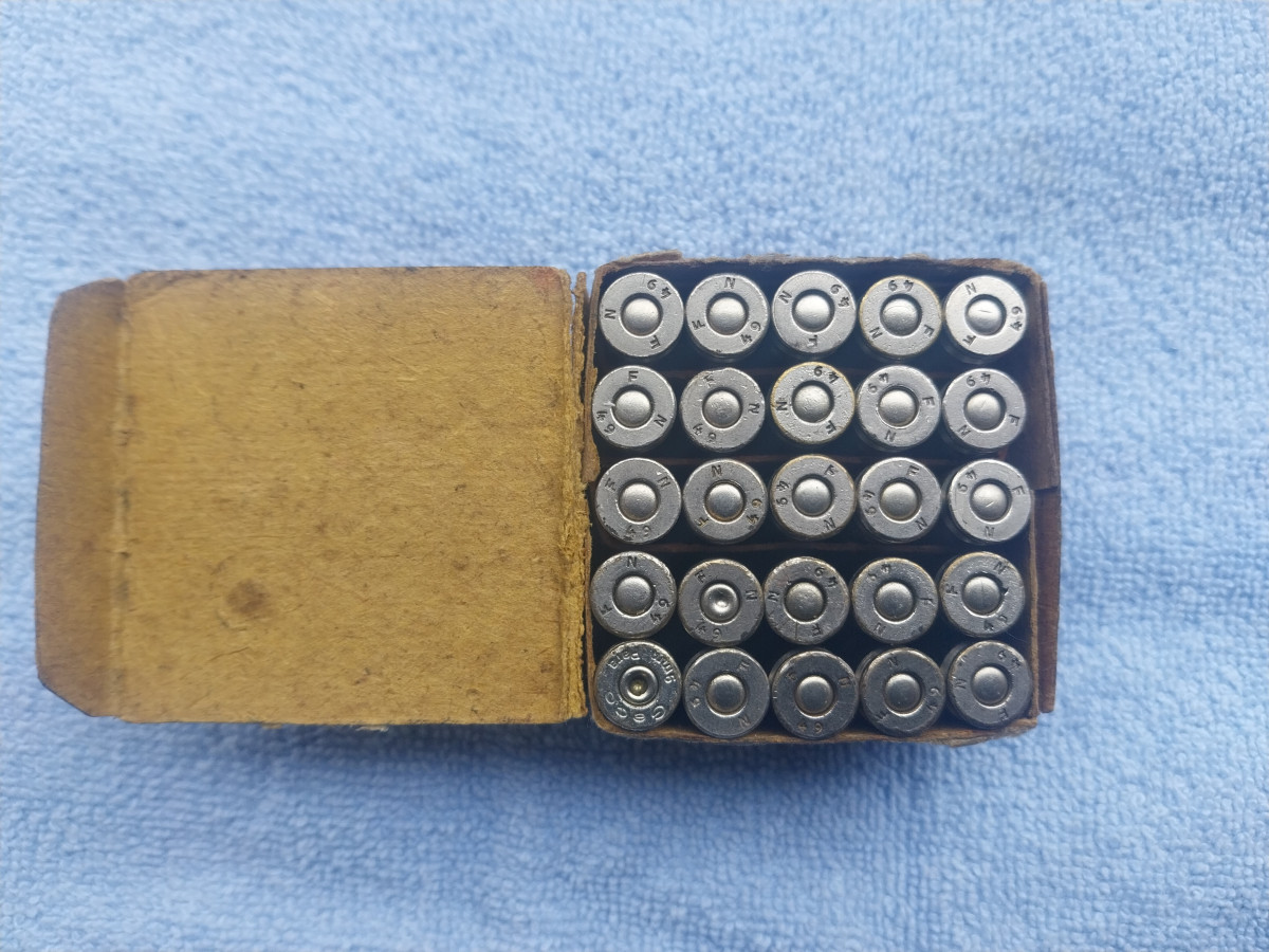 Zur Auktion kommt eine Schachtel mit 25 Ex Patronen von FN (Fabrik National Belgien). Die Patronen befinden sich wie auf den Bildern zusehen in der originalen Verpackung. Bodenstempel FN 47. Eine Patrone von Geco. Soweit mir bekannt wurde die Munition für die frühe Polizei hergestellt.
