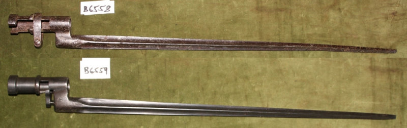 Zwei Russische Dillenbajonette zu Mosin Nagant Gewehren. Unterschiedlicher Zustand. Siehe Fotos. Fotos sind Bestandteil der Beschreibung. 1x Russisches Dillenbajonett M 1891 Mosin-Nagant aus dem 1.Weltkrieg, ohne Scheide, wohl Bodenfund, gedunkelt, fleckig, die Klinge, insbesondere die letzten 10 cm zur Spitze hin fein narbig. gestempelt: Klingenansatz 74718 und einige schwer erkennbare Punzen. Und 1x Russisches Dillenbajonett M 1891/31 Mosin Nagant aus dem 2.Weltkrieg, ohne Scheide, arsenalfrisch, die originale Brünierung noch zu 100 % vorhanden.