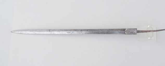 Verkaufe Hirschfängerklinge, wohl Chursachsen erste Hälfte 18. Jh.; auf rhombischer Klinge beidseitig geätzt mit Herrscherbrustbild und Schwertarm aus den Wolken; mehrfache lateinische Inschrift. Auf rechteckiger Fehlschärfe überkrönte "AR"-Chiffre. Klingenlänge (ohne Angel): 55,7 cm; Breite: 2,7 cm. Zustand siehe Fotos. Privatverkauf: Keine Garantie, Keine Rücknahme!