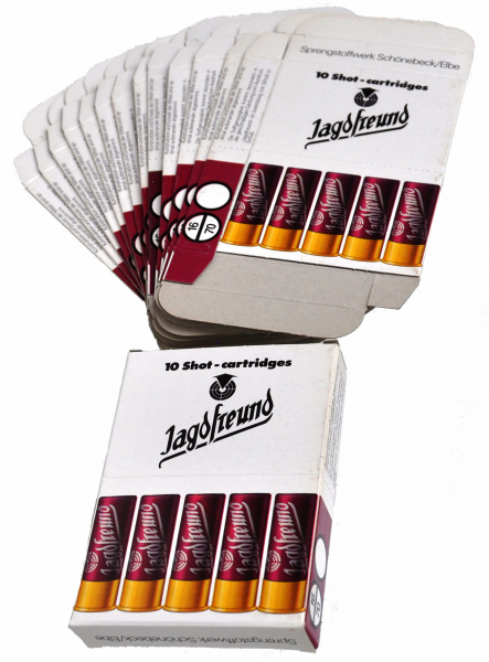Sie bieten auf 15 Stück leere neuwertige Schachteln für „Jagdfreund“ Cal. 16 Schrotpatronen.