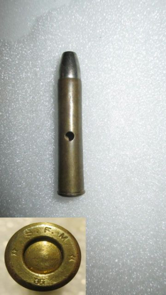 Sie bieten auf eine Patrone 7,62 Nagant lang für einen belgischen Revolver und ein Revolvergewehr, von denen nur wenige hergestellt wurden, siehe Brand Nr. 62. Bei der Patrone handelt es sich um einen originalen Board-Dummy der Fa. SFM ohne Pulver in gutem Zustand mit der üblichen Bohrung, was um 1900 den Vorschriften in Frankreich entsprach.