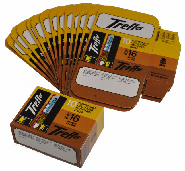 Sie bieten auf 15 Stück leere neuwertige Schachteln für „Treffer“ Cal. 16 Schrotpatronen.