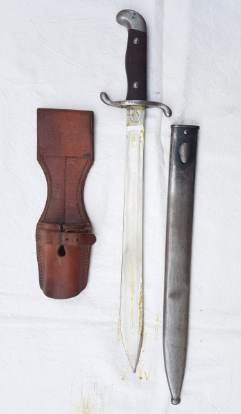Argentinien Artilleriemachete Mod. 1909, Hersteller: WKC Solingen, NUMMERNGLEICH , A 05445, Griff mit vernieteten Holzgriffschalen, Klinge mit Argentinischen Staatswappen, Rückseite Weyersberg Kirschbaum & Cie Solingen, Klingenrücken mit A gestempelt, Klinge blank neuwertiger Zustand, Stahlscheide, Vorderseite mit Delle, Brünierung abgerieben, Koppelschuh braunes Leder mit Schnalle, Rückseite mit Herstellerprägung: ROSSI CARUSO & CIE B.AIRES, neuwertiger Zustand, Gesamtlänge 52 cm, SEHR SELTEN, Zustand siehe Bilder. Privatverkauf, nach EU-Recht, keine Gewährleistung und Rücknahme. Versandkosten innerhalb der EU 21.-Euro.