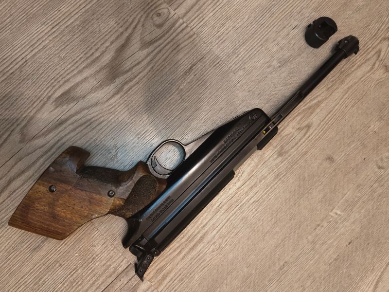 Verkaufe hier eine Feinwerkbau 65 Luftpistole. Der Seriennummer nach von 1969 0der 1970. Den Zustand würde ich für das Alter als gut bezeichnen. Kein Flugrost. Funktion wurde von mir geprüft, schießt wie am ersten Tage. Es ist ein Nill Formgriff verbaut, dessen Größe ich auf M mit Tendenz zu S beurteilen würde. Als Zubehör gibt es noch den alten Koffer (Nicht abschließbar), ein Laufgewicht (73 Gramm) und etwas Werkzeug.