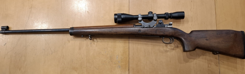 Aus meiner Sammlung biete ich ein schwedisches Mauser-System M/96 (Carl Gustafs Stads Gevärsfaktori, 1918) in M/63-Konfiguration an: 7,62×51 mm (BNP-Beschuss), schwedischer Feinstell-Diopter, Tunnelkorn und – besonders selten – die originale M63-„Hufeisen“-Zielfernrohrmontage, nummerngleich gestempelt „191“. Aktuell montiert ist ein Simmons-Zielfernrohr; das historische Albar 8×56 ist nicht dabei.