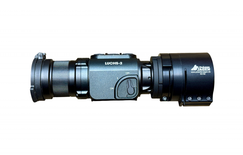 Das Vorsatzgerät kommt nebst der originalen Verpackung und dem dazugehörigen Ladekabel ebenso mit dem passenden Adapter der Marke Präzise Jagen, welcher auf der, in einer vorangegangenen Auktion angebotenen Blaser R93 und somit an einem Zeiss Victory V8 2,8-20x56 M montiert war.