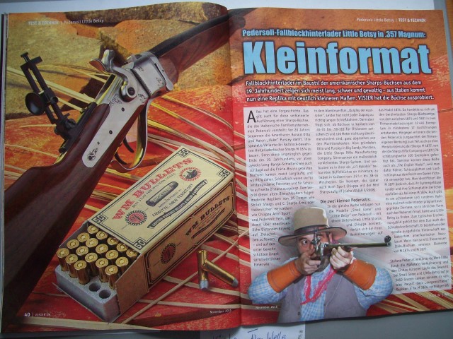 Für Waffenfreunde und Western Gewehrschützen +++ angeboten wird ein älteres Visier - Heft mit einem sehr interessanten Bericht für Westernschützen : ++ ** Pedersoli-Fallblockhinterlader Little Betsy in .357 Magnum ** -- Fallblockhinterlader im Stil der amerikanischen Sharps-Büchsen zeigen sich meist lang, schwer und gewaltig. Die Pedersoli Replika "Little Betsy" in .357 Magnum - aber was kann die Büchsenreplika ? -- In dem Bericht können Sie weitere Einzelheiten nachlesen - mit techn. Daten und Ergebnissen vom Schießtest mit Fabrikmunition in .38 Spezial und .357 Magnum. +++ und es gibt noch weitere interessante Berichte - z.B. für Pistolen-Schützen (neun Seiten ) - ** Großer Test - Fünf 1911er Government Pistolen in 9 mm ** +++ Das Heft ist gebraucht ; befindet sich aber in einem sehr guten Zustand. +++ Der Versand erfolgt als Großbrief mit DHL (unversichert) ; die Versandkosten gelten nur für Deutschland.+++ Bieter aus dem Ausland bitte Versandkosten vor Gebot erfragen. +++ Versandrabatt möglich, sehen Sie auch meine anderen Angebote. +++ Privatverkauf, daher keine Gewährleistung, Garantie oder Rücknahme. 6111 +++ Fragen bitte mailen.
