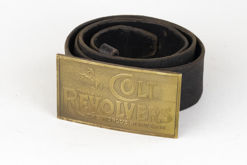 Verkauft wird ein Colt Ledergürtel aus Fertigung von Deane Adams England mit großer Messingschnalle.