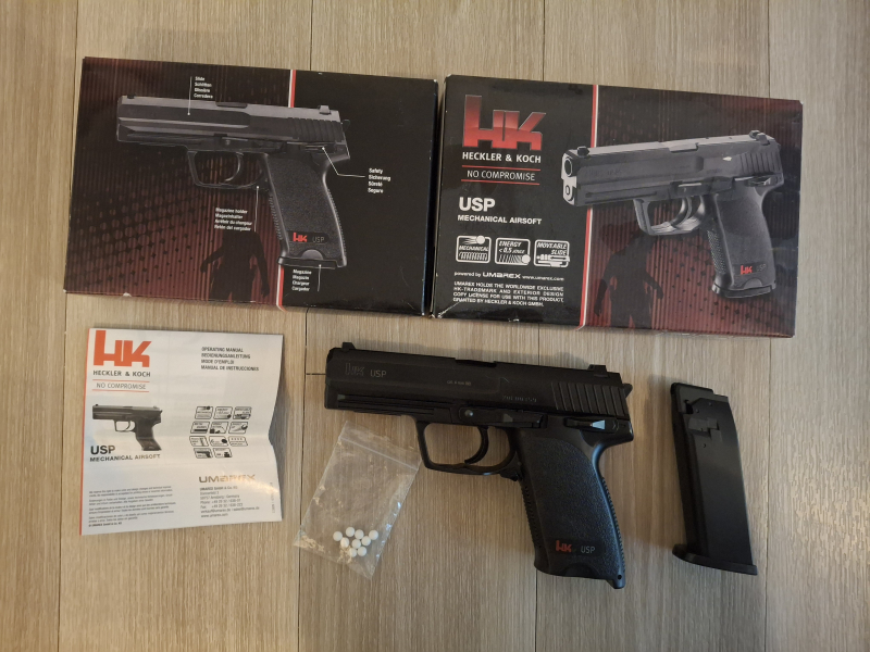 biete hier eine HK USP Airsoft Pistole 0,5 J mit F-Zeichen, 6mm, mechanisch zum Verkauf an. Pistole funktioniert, hat weniger als 100 Schuss gemacht, ist angenehm schwer, liegt gut in der Hand. Pistole wurde überwiegend für Trockentraining genutzt, da sie ihrem scharfen Vorbild sehr nahe kommt.