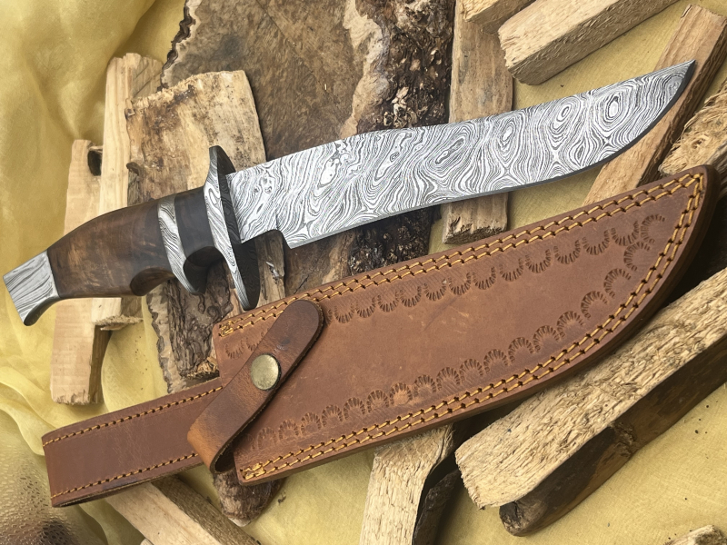 Typ: Handgefertigtes Damast-Jagdmesser aus über 200 Lagen Damaststahl. Walnuss-Holzgriff mit Damast-Parierstange und -Knauf. Inklusive Lederscheide.