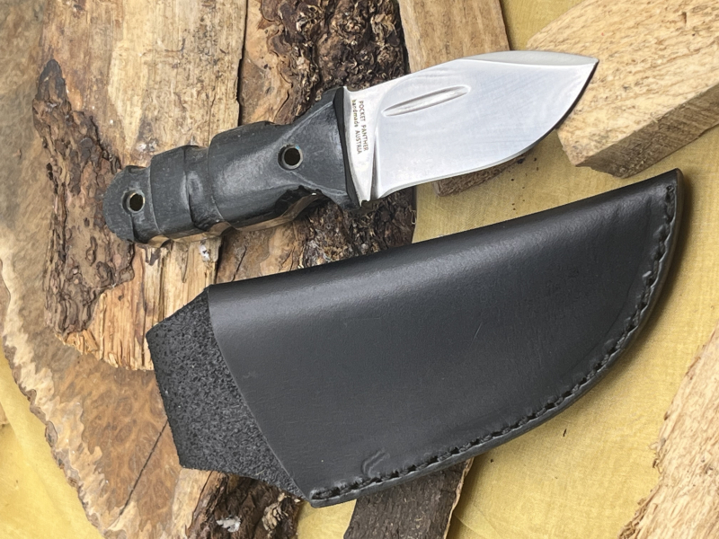 - Typ: Handgefertigtes Jagdmesser aus D2-Stahl. Micarta-Griff. Inklusive Lederscheide.