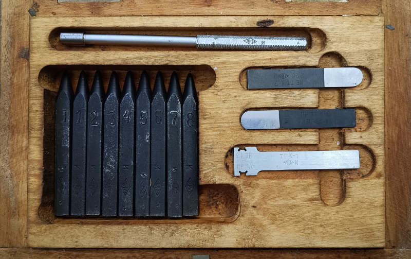 Zusätzlich enthält der Satz originale Ziffernstempel (Prägestempel) mit einer Höhe von 3 Millimetern.