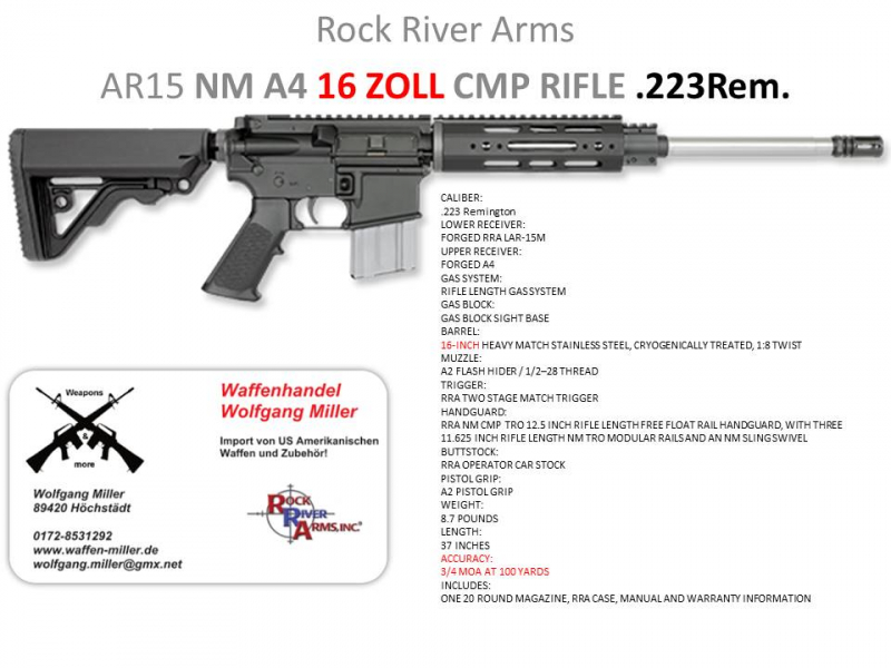 Biete ein AR15 im Kaliber .223Rem. Modell A4 CMP National Match des US amerikanischen TOP Herstellers Rock River Arms! Sie werden mit dieser Waffe jeden anderen Selbstlader in Punkto Präzision und Verarbeitung schlagen! Kein Oberland, Schmeisser, Windham, Hera!!! Die Waffe verfügt über einen 16-INCH Stainless Match Lauf , 1:8 , Lauf freischwingend, RRA TWO STAGE MATCH Abzug und 10 Schuss Magazin! Die Waffe wird im Rock River Koffer geliefert! Bitte vor dem Kauf Kontakt zu mir aufnehmen! Ein kostenloses Einlagern bis zur EWB ist kein Problem! Rock River Arms gehört zu den besten Waffenherstellen Weltweit und ist in den USA die Nummer 1 Sie werden keine bessere Waffen bekommen! Auch andere Modelle in verschiedenen Kalibern des Herstellers lieferbar! Lieferzeit und Preis bitte anfragen!!!!!! WWW.Waffen-Miller.de Rock River Arms ist einer der Weltweit besten Waffenhersteller, sollten Sie mit der Waffe nicht zufrieden sein, nehme ich sie wieder zurück(qualitativ oder Schussleistung) !Rock River Arms ist der einzige Hersteller der eine Präzisionsgarantie von einem 3/4 MOA auf 100m gibt. www.waffen-miller.de Wir führen auch Waffenexporte ins Europäische Ausland durch, fragen Sie an !!