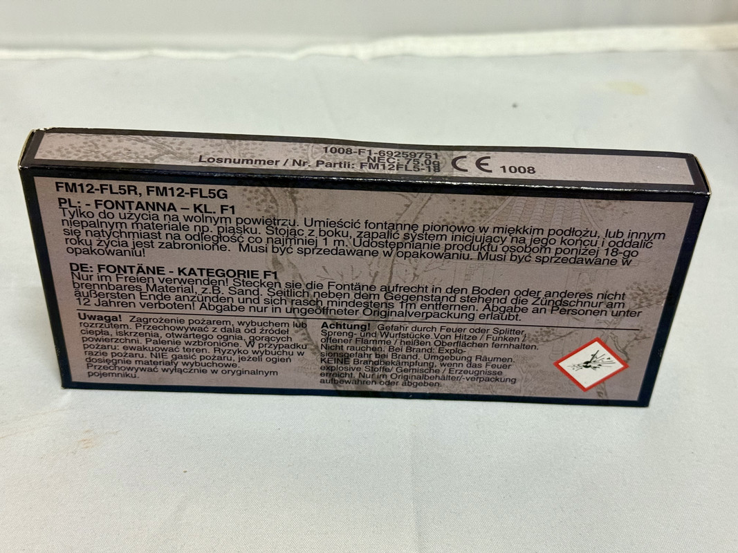 Packung aus 10 Fontänen mit leuchtstarker farbiger Flamme und abschließendem Auswurf von Silbercrackern. Pro Packung sind jeweils 5 Stück in grün und 5 Stück in rot enthalten. Achtung, Artikel ohne Standfuß, muss in den Boden gesteckt werden.
