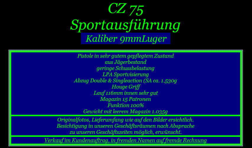 Artikel-ID: 20145139 ArtikelNr. des Verkäufers: 11680 Kategorie: Grosskaliber Kurzwaffen > Sportpistolen > CZ