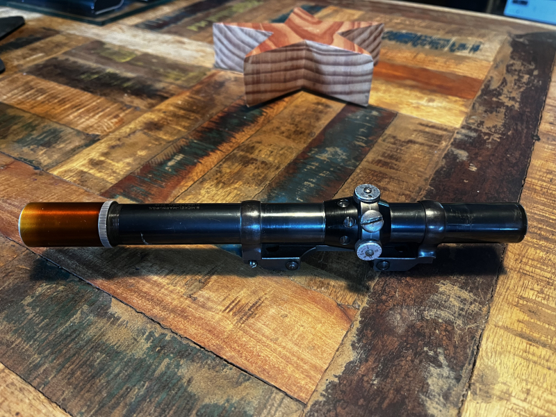 Zum Verkauf kommt ein antikes Zielfernrohr der Marke Nickel-Marburg , Supra 3 x 36, Absehen 1. Augenscheinlich funktioniert die Verstellung. Das Balken rechts beim Absehen hat einen leichten Bogen. Linsen sind klar.