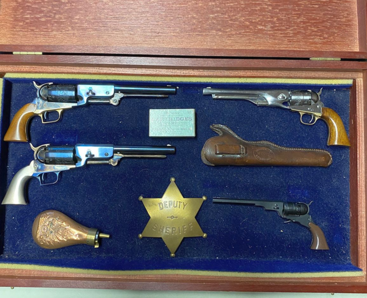 Aus Altersgründen und nur schweren Herzens biete ich 4 Miniatur-COLT-Revolver der Firma UBERTI/Italien im mMaßstab 1:2,25 an. Alle Revolver sind nicht schussfähig, doch alle Läufe sind vollständig durchbohrt. Die Mechanik aller Stücke ist regelrecht und ohne Makel.