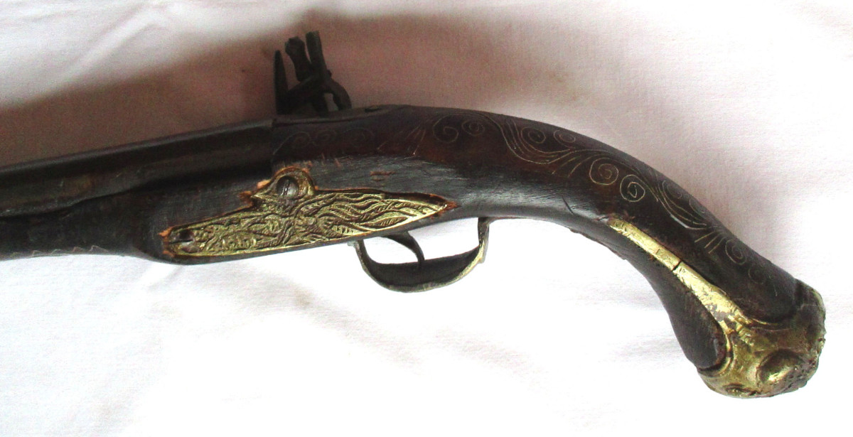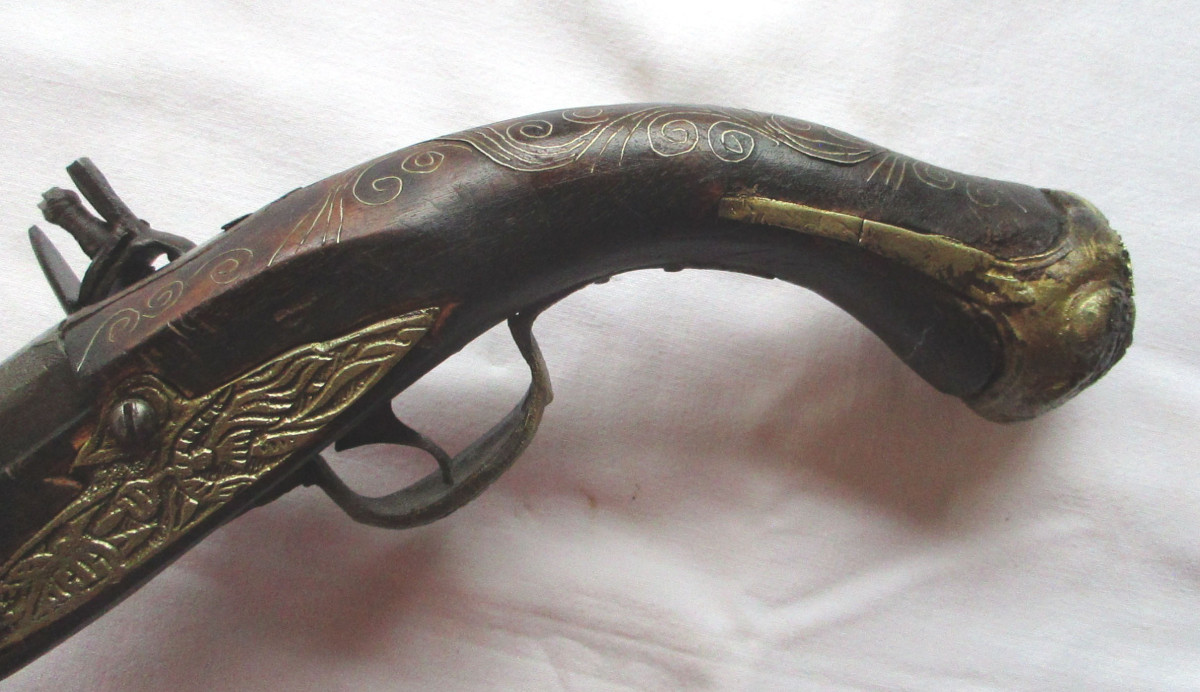 Vorderlader, Steinschloss - Pistole Steinschlosspistole, mit Messing.- oder Silberfaden Einlagen, und sonstigen Messing - Applikationen. Hahn lässt sich bewegen, rastet aber nicht ein. Schöne alte Deko – Waffe, aus Nachlass. Gesamtlänge ca. 50 cm. Frei ab 18. Jahren. Zustand siehe Foto.