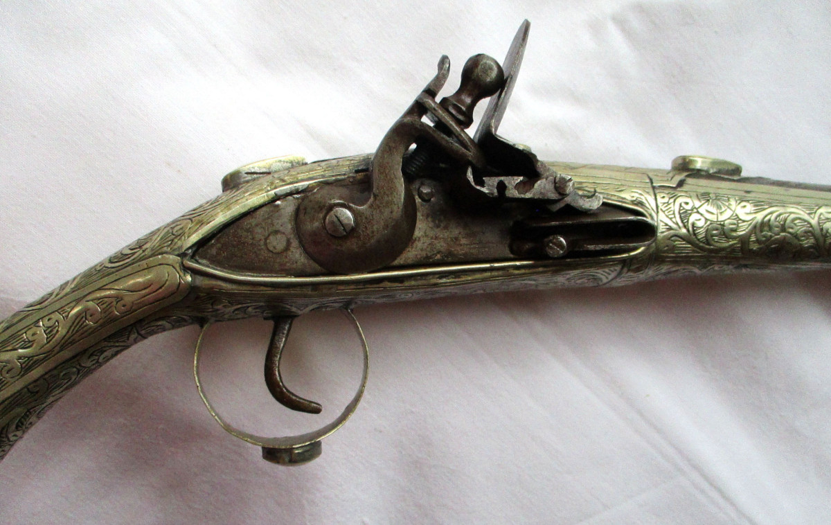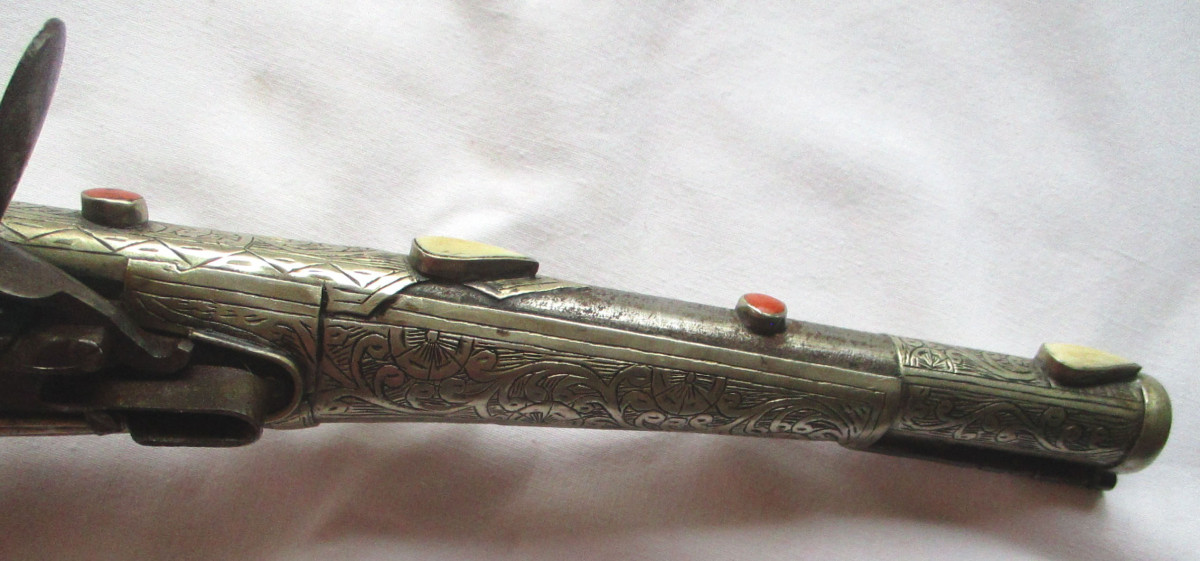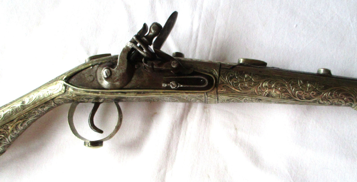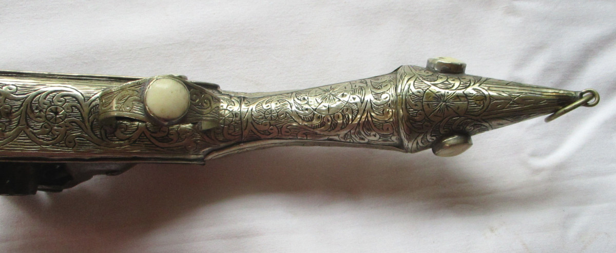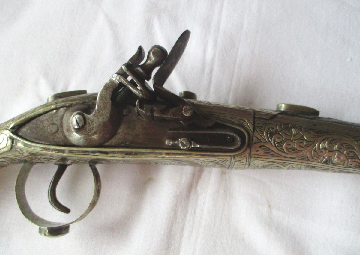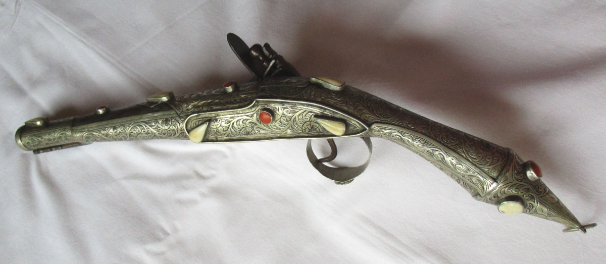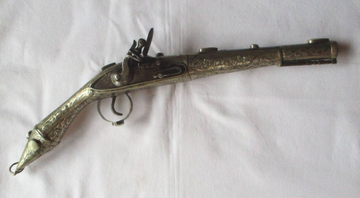 Vorderlader, Steinschloss - Pistole Steinschlosspistole, komplett in Silbermontierung. Schloss, lässt sich spannen und abschlagen, sehr starke Feder. Sehr schöne alte Deko – Waffe, aus Nachlass. Gesamtlänge ca. 47 cm. Frei ab 18. Jahren. Zustand siehe Foto. Sie kaufen, was Sie sehen. Versand innerhalb DE 12.-- Euro. Versand in EU-Staaten bitte anfragen. PayPal- Zahlungen können nicht angenommen werden. Versanderfolgt, grundsätzlich versichert. Zustand (siehe Fotos) Privatverkauf, Sachmängelhaftung ist ausgeschlossen, daher keine Garantie, kein Umtausch und keine Rücknahme.