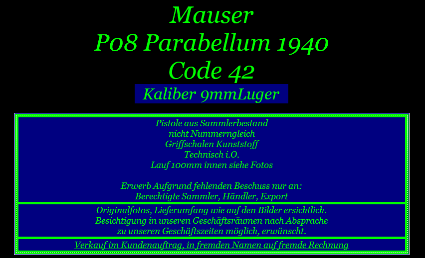Bei der angebotenen Ware handelt es sich um eine gebrauchte Waffe, die einen historischen Wert als Sammlerstück hat und zudem als Antiquität zu bezeichnen ist. Entsprechend der Ziff. 18 der VERORDNUNG (EU) 2023/988 DES EUROPÄISCHEN PARLAMENTS UND DES RATES vom 10. Mai 2023 über die allgemeine Produktsicherheit, zur Änderung der Verordnung (EU) Nr. 1025/2012 des Europäischen Parlaments und des Rates und der Richtlinie (EU) 2020/1828 des Europäischen Parlaments und des Rates sowie zur Aufhebung der Richtlinie 2001/95/EG des Europäischen Parlaments und des Rates und der Richtlinie 87/357/EWG des Rates" ist diese Verordnung auf dieses Sammlerstück nicht anwendbar.