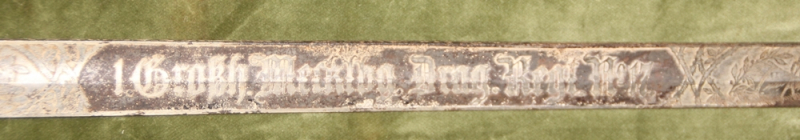 Klinge eines Großherzoglich Mecklenburgischen Kavalleriedegens M 89, Eigentumstück, gerade, einschneidige Klinge mit konkaven Hohlkehlen, beidseitig mit Zierätzungen, auf einer Seite, flankiert von Zierornamenten die bekrönten, ligierten Initialen des Großherzogs und zwei Schwadronen Kavallerie im Gefecht, auf der anderen Seite, flankiert von Zierornamenten eine ehemals gebläute Kartusche mit der Inschrift „1.Großherzogl.Mecklenbg. Drag.Regt. No. 17“. die Vernicklung der Klinge teilweise abgeplatzt, großflächige Roststellen, teilweise narbig. Belegstück für ein seltenes Stück, für Bastler. Siehe Fotos. Fotos sind Bestandteil der Beschreibung. Alle Angaben nach bestem Wissen und Gewissen. Dies ist ein Privatverkauf. Gemäß EU-Recht unter Ausschluss von Gewährleistung und jeglicher Sachmängelhaftung. Der Käufer ist selbst verantwortlich für die Einhaltung der gesetzlichen Vorschriften / des Waffenrechtes seines Landes. Fragen bitte rechtzeitig vor dem Auktionsende stellen. Ich beobachte meine Auktionen und mein Mail-Postfach nicht permanent. Daher bei kurz vor Auktionsende gestellten Fragen keine Garantie auf eine rechtzeitige Antwort. Verkauf nur gegen Vorkasse. Banküberweisung oder PayPal (Bei Zahlung über PayPal erhöht sich der Kaufpreis um die von PayPal einbehaltene Gebühr, bei Zahlung mit der Option Geld an Freunde senden entfallen diese zusätzlichen Kosten) Bei Selbstabholung ist Barzahlung möglich. Die Versandkostenpauschale deckt außer den reinen Portokosten auch einen Anteil an Verpackungs und Fahrtkosten zum nächstgelegenen Paketshop. Versandkosten sind nicht verhandelbar. Die Versandkosten sind Kosten für den Inlandsversand. Versandkosten ins Ausland gemäß den aktuellen Preislisten der beauftragten Paketdienste sind höher.