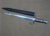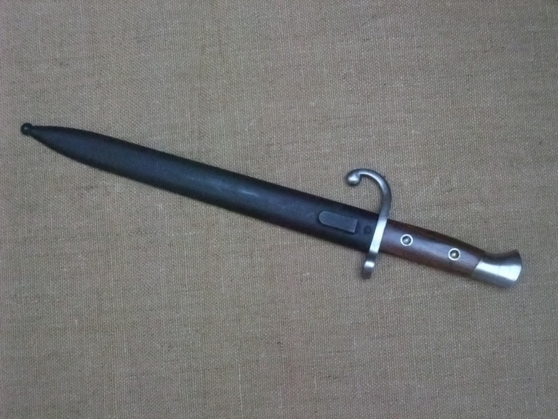 Dieses hervorragend verarbeitetes Bajonett entspricht den südamerikanischen Modellen und wurde wahrscheinlich in Belgien gefertigt. Weder auf dem Bajonett noch auf der Scheide gibt es Hinweise auf den Hersteller und auf den Auftraggeber. Die Rückenklinge mit beidseitiger breiter Hohlkehle und Mittelspitze ist durch die Angel mit dem Gefäß verbunden. Der Gefäßknauf hat eine 31,5 mm lange T-förmige Nut und einen gefederten Sperrdrücker zum Aufpflanzen auf die Langwaffe. Die eiserne Parierstange hat ein stark nach vorne gebogenen Ende und auf der anderen Seite einen Mündungsring. Die beiden schön gemaserten Holzgriffschalen sind mit 2 Spezialschrauben am Griff/Gefäß befestigt. Die schwarz lackierte Blechscheide mit Federeinsatz und Tragehaken im Mundbereich hat eine Kugel als Ortabschluss. Das Bajonett ist neuwertig, die Scheide hat einige punktförmige Rostmarkierungen.