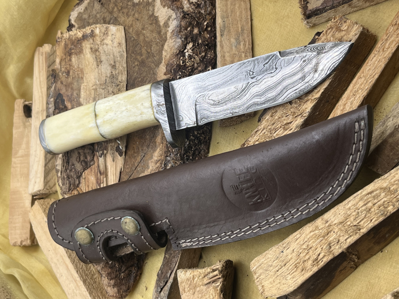 Typ: Handgefertigtes Jagdmesser aus über 200 Lagen Damaststahl. Griff aus Knochen mit Damast-Parierstange und Damast-Knauf. Inklusive Lederscheide.