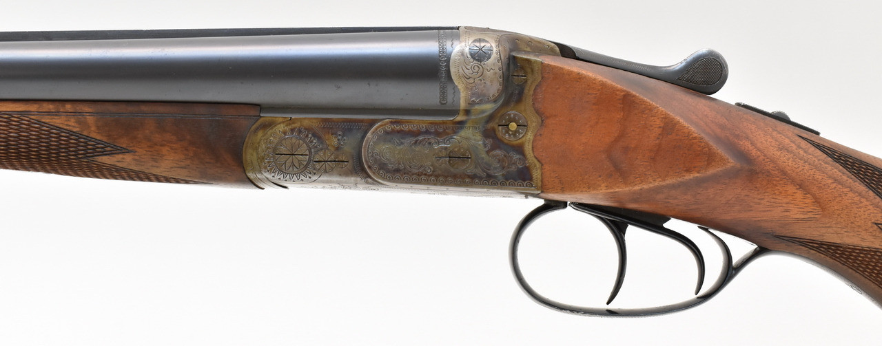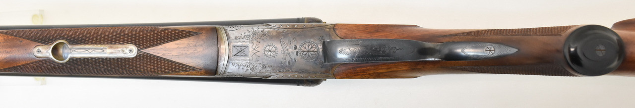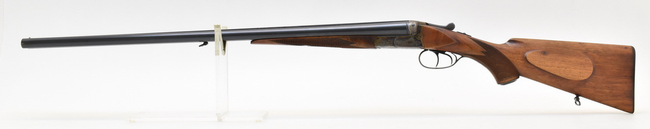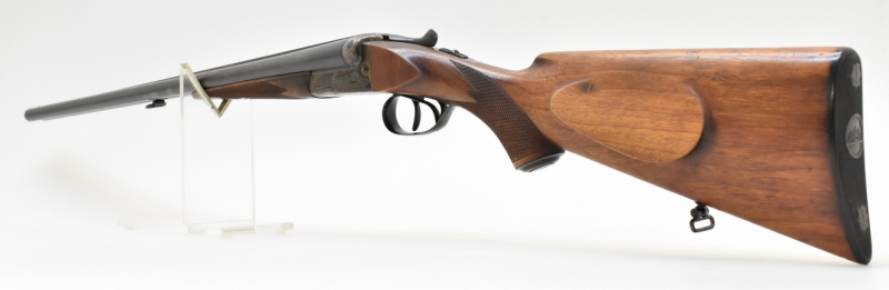 Klassische Querflinte mit Doppelabzug und seitlichen Signalstiften ohne Ejektor. Blanke Läufe mit halb/voll Choke und kleinen Schussriefen, dichter Verschluss. Brünierung mit partiellen Rostnärbchen, das Schaftholz zeigt nur wenige Kratzer. 36,5cm langer Nussbaumschaft mit Backe und Pistolengriff. (Gemessen vorderer Abzug bis Mitte Schaftkappe) Doppelte Laufhakenverriegelung und Schiebesicherung auf dem Kolbenhals. Beschuss von 07/1954.