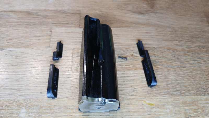 Beschädigt sind die Drücker zur Befestigung im Gewehr: eines ist gebrochen, eines sitzt nicht mehr im Magazin, ist aber ganz, eine der Federn fehlt, siehe Fotos