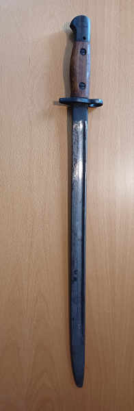 Sie bieten hier auf ein Bajonett 1907 aus dem 1. Weltkrieg. Die 16 3/4 Zoll lange Klinge sitzt fest im Griff. Der Griff ist in Ordnung. Das Bajonett weißt bei der Klinge Alterunsspuren auf.