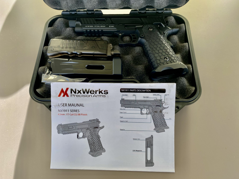 Lieferumfang: CO2 Pistole NxWerks NX 1911 Boa, robuster Waffenkoffer, Speedloader und Bedienungsanleitung