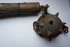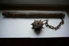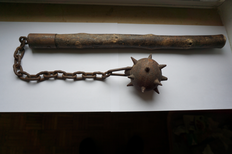 massiver alter Holzgriff, schwere Eisenkette, sehr schwere massive Eisenkugel mit 16 Eisendornen besetzt