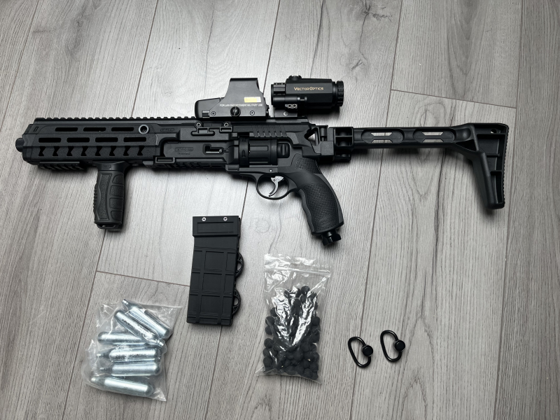 Zu Verkaufen ist ein Set bestehend aus der TR 50 Gen 2, dem Cabine Conversion Kit, einem RedDot, einem Magnifier Booster 3 Fach von Vector Optics, Handgriff vorne, Lockpins als Slingbefestigung, zwei Zusatzmagazine mit Halter, ein paar Rubberballs und ein paar CO2 Kapseln. Ich habe das Set selber so hier bei egun gekauft aus Zeitmangel soll es aber nun wieder verkauft werden. Ein paar Gebrauchsspuren und Kratzer sind da, an den Schienen wegen den zusätzlichen Anbauteile. Funktion ist Tadellos.