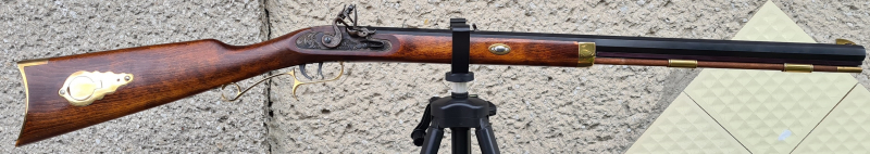 Ich löse meine kleine Sammlung auf. Hier ein Vorderladergewehr der bekannten spanischen Waffen-Marke „DIKAR“. Es ist ein „Hawken-Rifle“ mit gezogenem schweren Cal. 45 8-Ecklauf in der sehr seltenen Ausführung mit Steinschloß. Der Buchenschaft ist mit einer dekorativen Messing Patch-Box ausgestattet. Der Abzug hat einen Stecher. Die Waffe befand sich als Neuerwerb nur als Deko-Stück in meiner Sammlung und steht seit einiger Zeit nur noch im Waffenschrank und nimmt Platz weg. Abgesehen vom staatlichen Beschuss des Laufes wurde diese Waffe noch nie abgefeuert. Daher Bestzustand. Ein tolles Stück für jeden Schützen, Liebhaber und Sammler.