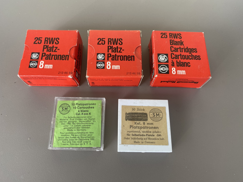 Servus zum Verkauf kommen hier 8mm Knall Kartuschen, 3 x 25 Stück von RWS , und 2 x 10 Stück von SM.