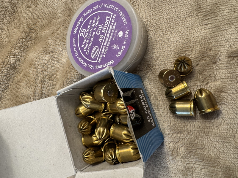 Verkaufe hier insgesamt 75 Schuß´.45 Knallpatronen Cal. 45 short für Schreckschussrevolver des Kalibers, aufgeteilt in 2 Packungen, 1 x 25 Patronen von der Firma Wadie (Made in Italy) sowie eine Packung mit 50 Patronen der Firma Fiocci (siehe Fotos).