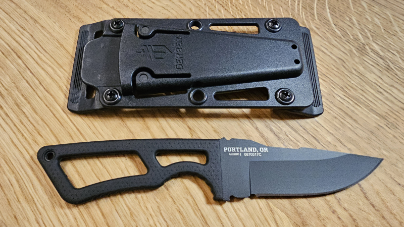 Gerber Messer, mit Scheide aus Kunststoff. Unbenutzt. 8cm Klingenlänge, Material 420HC, Grifflänge 9,2cm, Gewicht 50g.