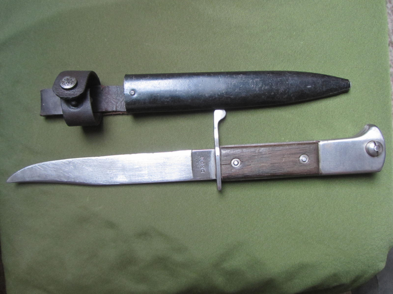 Der Dolch hat eine Bowieklinge, auf der einen Seite steht D.R.G.M.,auf der anderen steht wohl Demag, aber schwach eingeschlagen und besser