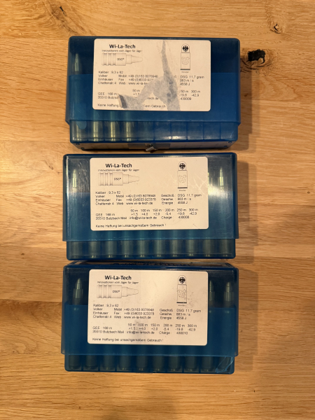 Hier gibt es 49 Patronen Wi-La-Tech DSG 9,3x62 da ich mittlerweile selbst TTSG lade. Die Kunststoffkästen sind teilweise defekt.