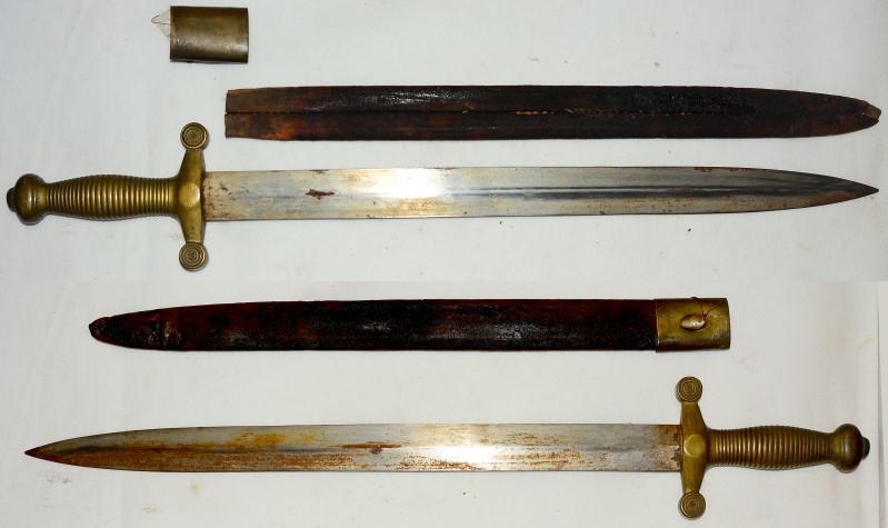 Original Glaive (Infanterieschwert) aus Frankreich, erleichtertes Modell 1851, dachförmige Klinge ohne rille, schwerer Messinggriff, keine Stempelung, an der Originalscheide fehlt das Ortblech und das Mundblech müsste neu eingeklebt werden. auch der Faden der Scheidennaht hat sich altersbedingt aufgelöst, Klingenlänge 46,4cm, Gesamtlänge 59,7cm, insgesamt für das Alter guter Zustand