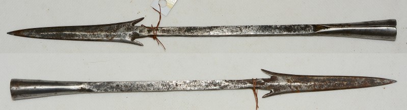 Original afrikanische Speerspitze, eventuell von Fischspeer, zierlich, Gesamtlänge 27,1 cm, die Klinge 9,7cm lang, die Tülle für einen Schaft mit ca. 13mm Dicke vorgesehen