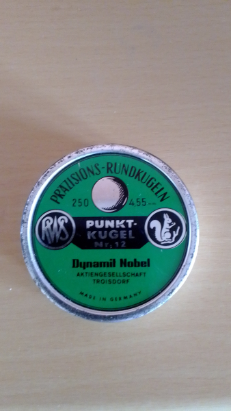 biete eine Dose (250 St.) Präzisions-Rundkugeln Nr.12 der Marke RWS. Durchmesser 4,55 mm.Blei. Original verschlossen.