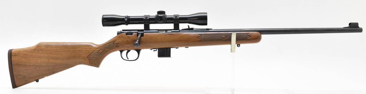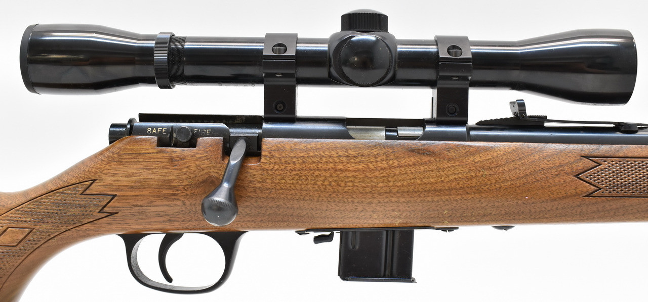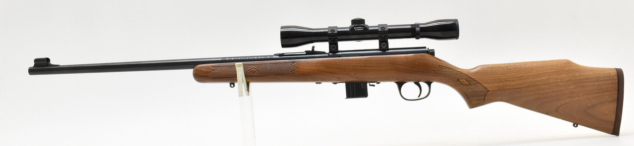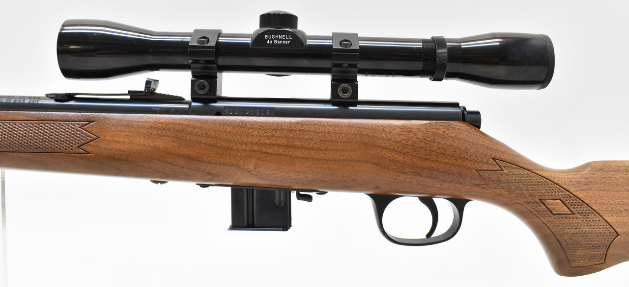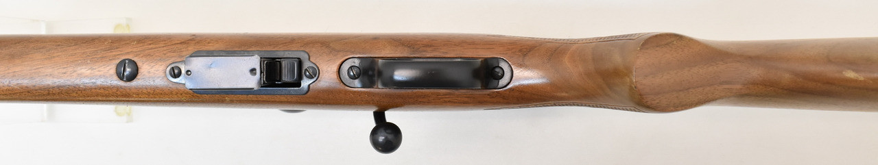 Amerikanisches KK-Gewehr mit einem 7-Schuss Einsteckmagazin, seitlicher Sicherung und einem Bushnell ZF Banner 4x Duplex Absehen. 35,5cm langer Schaft ( gemessen Abzug bis Mitte Schaftkappe.) Erstbeschuss von 1992.