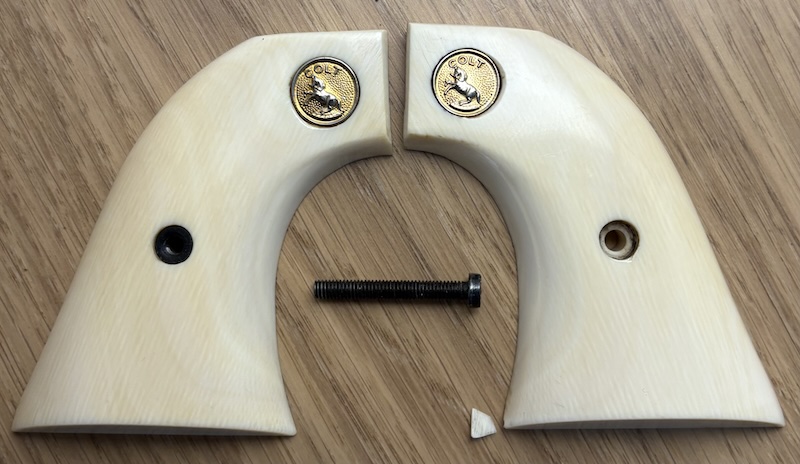Verkaufe ein Griffschalen-Set aus aged Elfenbein Polymer. Hersteller unbekannt. Mit Colt Medaillon und Schraube, wie abgebildet. Ein Splitter innen liegt bei. Zum Anpassen an Colt Single Action Army Revolver oder Nachbauten.