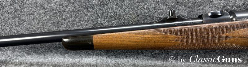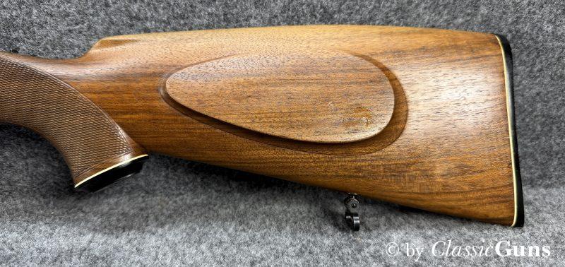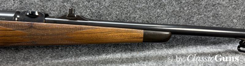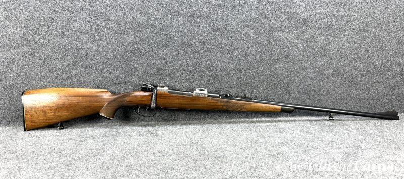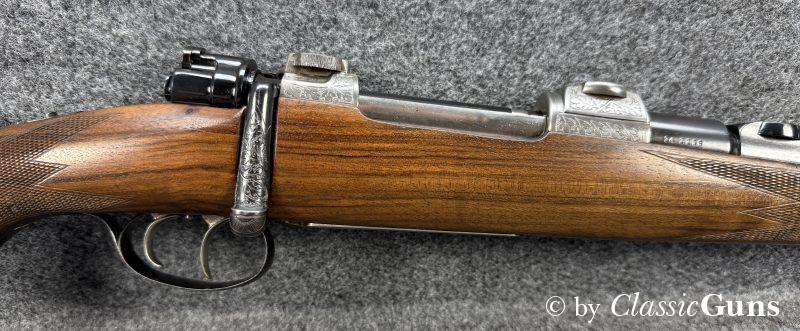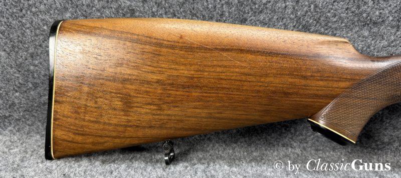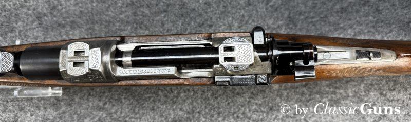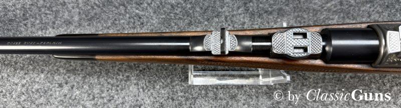 615 mm langer Lauf aus BÖHLER-SPEZIALSTAHL und mit neuwertigem Zug-/ Feldprofil, markiert mit „JOSEF JUST – FERLACH“. Sehr gut erhaltene Brünierung der Stahlteile. Erstklassig erhaltener Schaft aus gutem Nussbaum, mit nur minimalen Gebrauchsspuren und mit Vorderschaftabschluss aus Horn. Systemhülse, Magazindeckel und Abzugsbügel hochwertig graviert. SEM-Basen, klassische 3-Stellungssicherung und zusätzliche Schiebesicherung auf dem Kolbenhals, Deutscher Stecher, Mittelschaftmagazin für fünf Patronen.