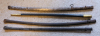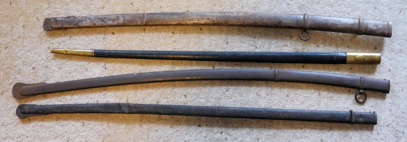 | 1 Lederscheide mit Messingbeschläge die Naht ist geschlossen mit Dellen, 1 Metallscheide, hat ein paar Dellen und 2 kleine stellen wo sie durchrostet ist mit Flugrost, 1 Scheide ohne Dellen mit Flugrost, 1 Scheide narbig mit Flugrost sie ist an zwei Stellen fast durchbrochen