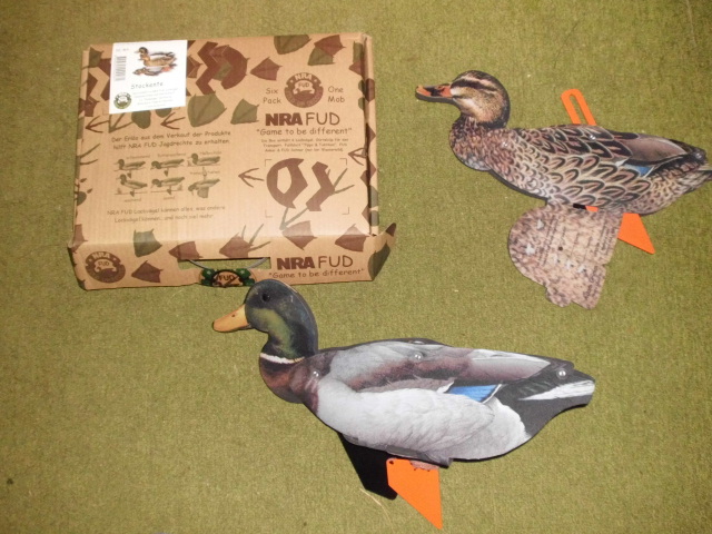 Neuwertige FUD-Lockenten zum Zusammenfalten, daher leicht zu transportieren. Zum Aufstellen oder auf dem Wasser. Drei von sechs Stück habe ich mal eingesetzt, aber am Fließgewässer ergaben sich manche Tücken. Drei sind unbenutzt.